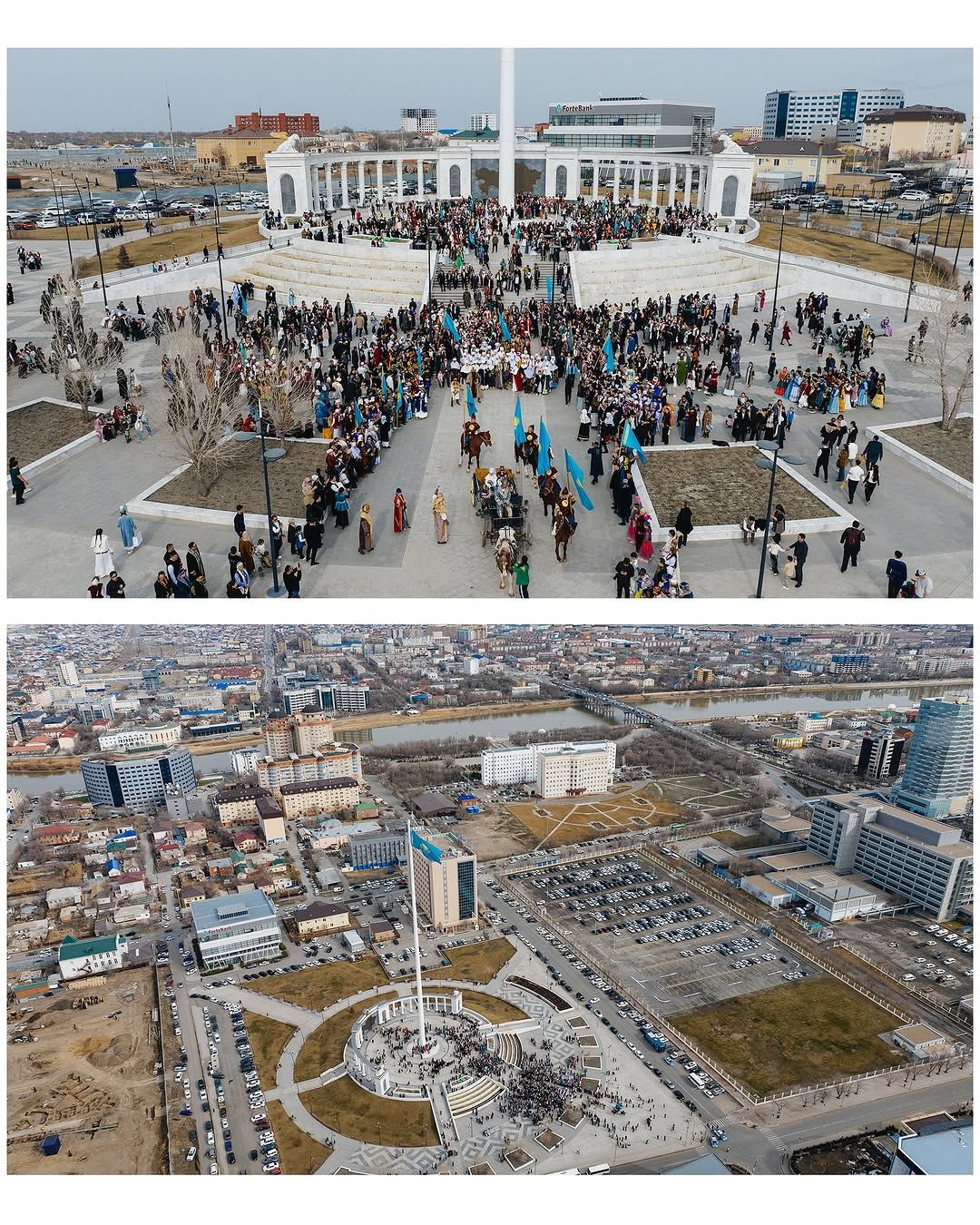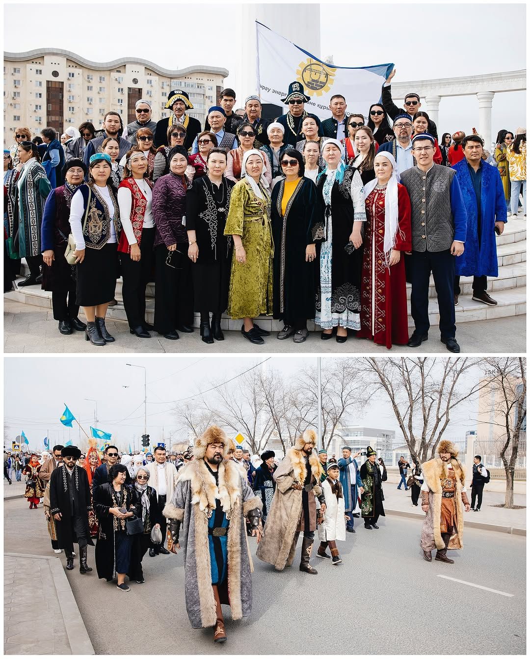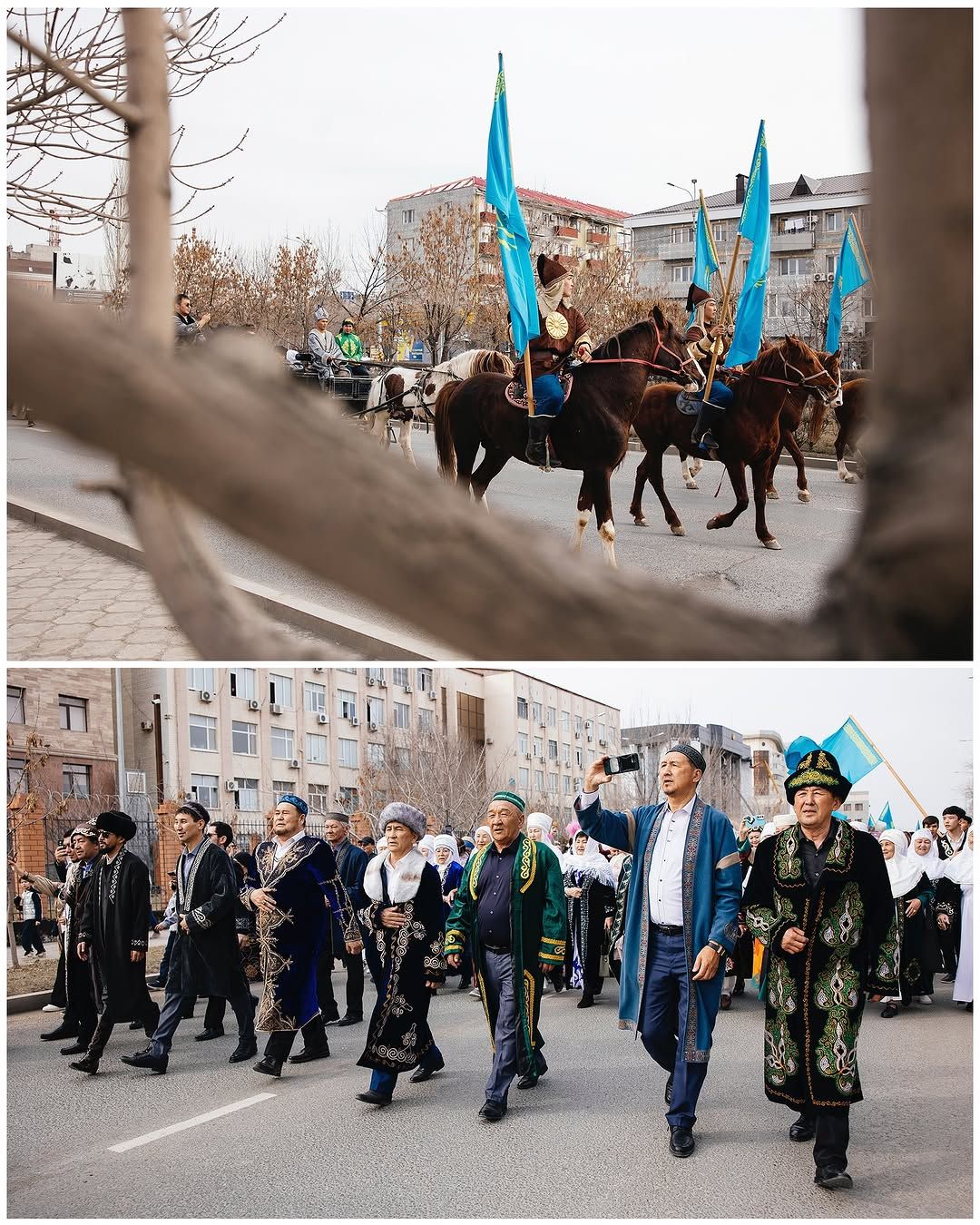 Шествие, начавшееся с флагштока в центре города, продолжалось до площади им. Исатая и Махамбета. Возглавили парад всадники с Государственными флагами в руках. Жители Атырау пришли на мероприятие в национальных костюмах и подарили друг другу праздничное настроение.