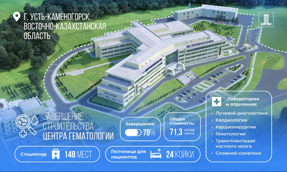 Общая стоимость проекта – 71,3 млрд тенге. На сегодня объект завершен на 78%. Возведен каркас, подведены наружные инженерные сети, подготовлены кровля, фасад, оконные блоки, частично выполнена внутренняя отделка.