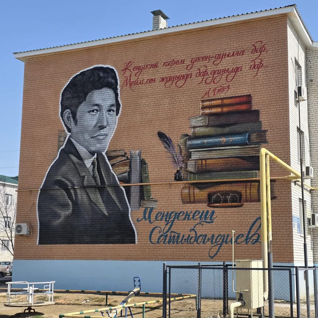 В городе Кульсары Жылыойского района украшают фасады многоквартирных домов. На них изображены портреты известных казахстанских личностей, сопровождаемые их мудрыми высказываниями.