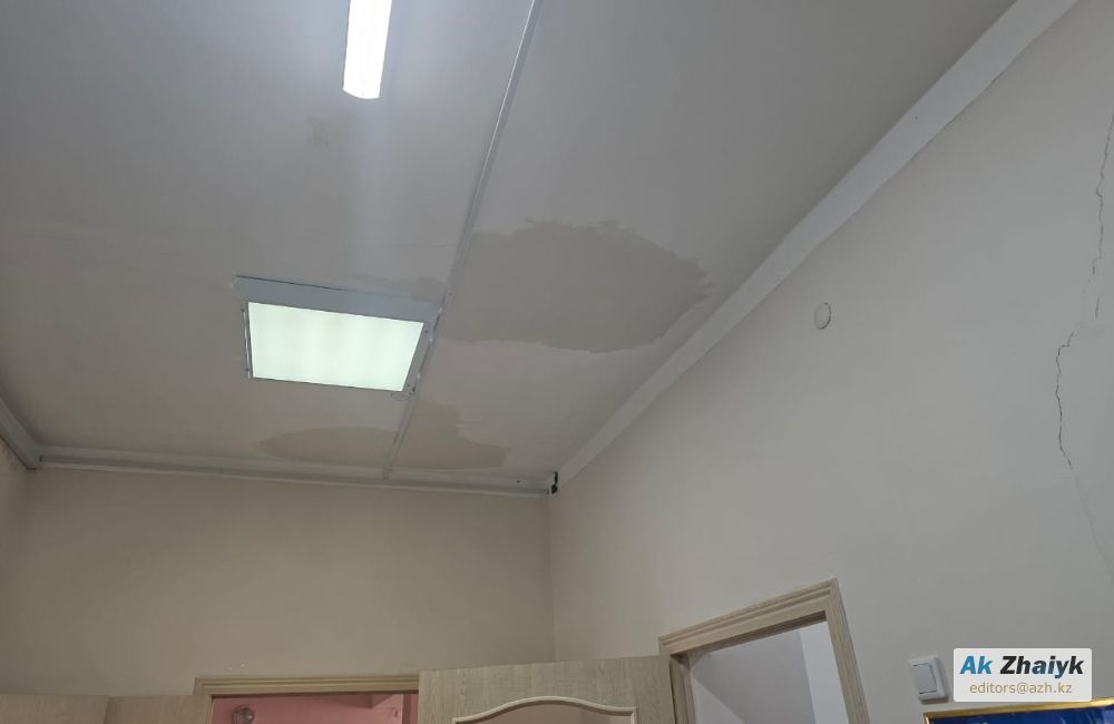 Заместитель заведующей по хозяйственной части Асылбек КУСПАН рассказал, что в жаркую погоду с потолка начинает капать черная смола.