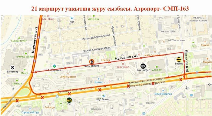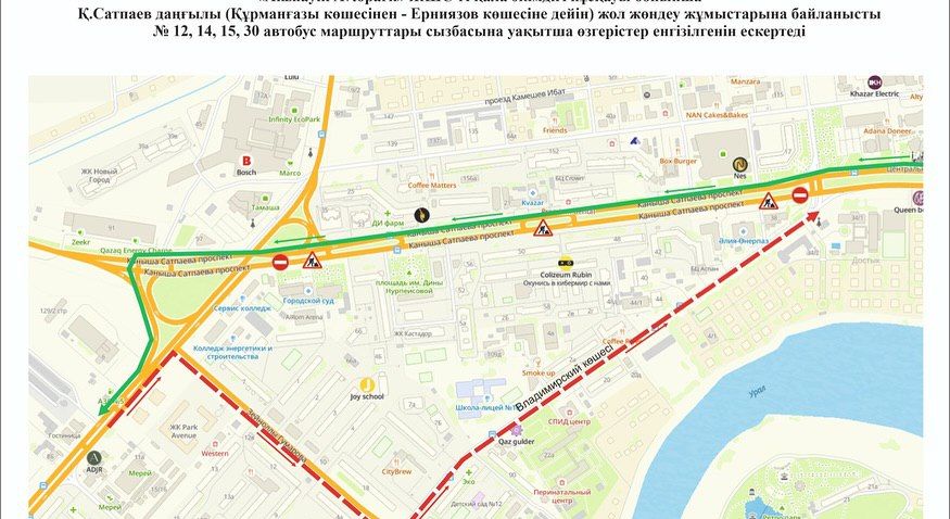 На время работ будет временно перекрыт участок от моста по улице Курмангазы до перекрёстка с улицей Кабдырахмана Ерниязова. В связи с этим изменятся некоторые маршруты общественного транспорта.