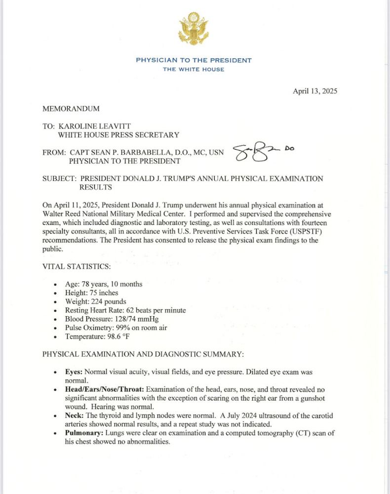 Президент Трамп находится в отличном состоянии здоровья, демонстрируя хорошую сердечно-сосудистую, лёгочную, неврологическую и общую физическую форму. Его активный образ жизни способствует общему благополучию. Президент регулярно участвует в публичных мероприятиях, часто одерживает победы в гольфе. Трамп обладает отличным когнитивным и физическим здоровьем и полностью готов выполнять обязанности главнокомандующего и главы государства.