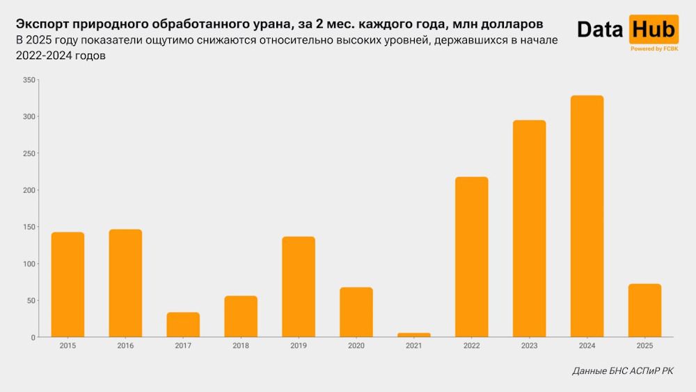 - Россия, на которую в начале 2024 года приходилось $195,6 млн экспорта, в 2025 году вообще не получила казахстанского урана.