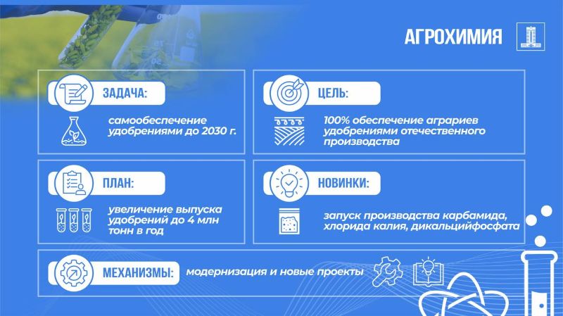 «За счет реконструкции и новых проектов до 2030 года общий объем удобрений будет увеличен до 4 млн тонн», — отметил министр.