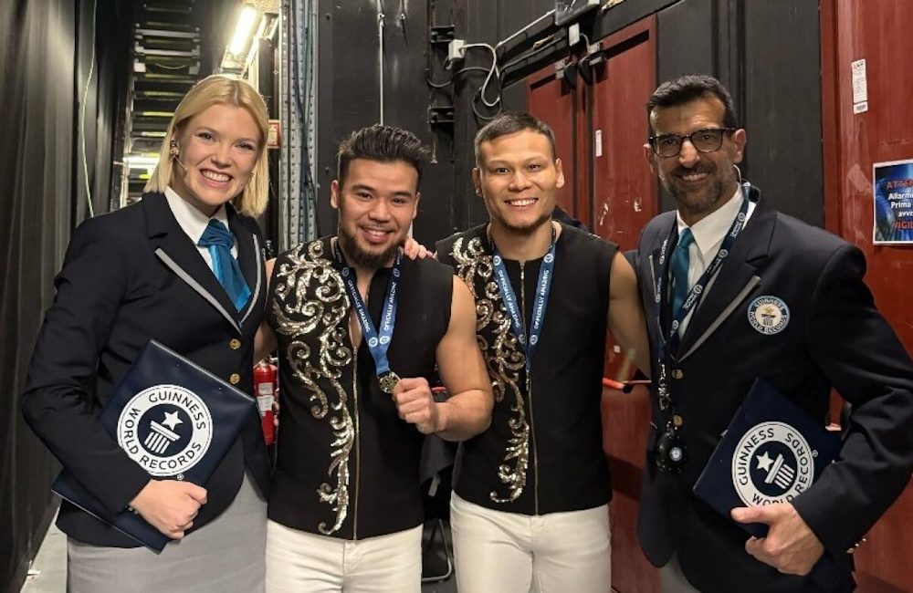 Казахстанские акробаты установили мировой рекорд на престижном международном шоу Lo Show Dei Record в Милане (Италия). В номинации «Самое быстрое время подъема и спуска по двум лестницам с человеком, стоящим в стойке на руках на голове» они показали результат 36,66 секунды, поразив зрителей и жюри.