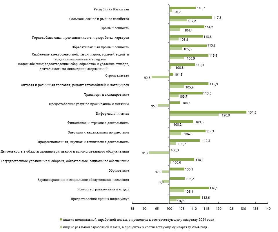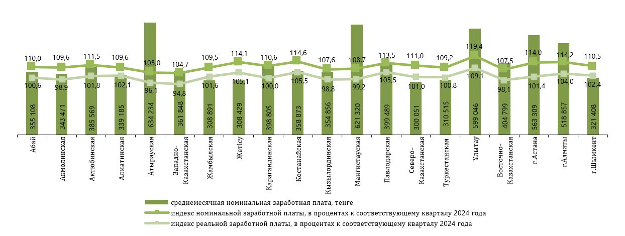В региональном разрезе наибольший рост среднемесячной номинальной заработной платы за I квартал 2025 года по сравнению с соответствующим кварталом 2024 года сложился в Ұлытауской области – на 19,4%, в Костанайской области – на 14,6%, в г. Алматы – на 14,2%.