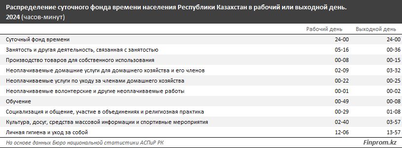 А чем по статистике заняты казахстанцы в течение дня? Согласно официальным данным, в 2024 году больше всего времени у казахстанцев занимали личные дела (формально это называется «личная гигиена и уход за собой»). В том числе во время рабочей недели в день на это уходит 12 часов 6 минут, в выходные — 13 часов 57 минут. Спят казахстанцы в пределах рекомендуемой нормы: в будни — 8 часов 48 минут, в выходные — 10 часов 4 минуты. На приём пищи и питьё тратится 1 час 49 минут в рабочий день и 2 часа 5 минут в выходной. Непосредственно на личную гигиену и уход приходится 1 час 21 минута в будни и 1 час 33 минуты в выходные.
