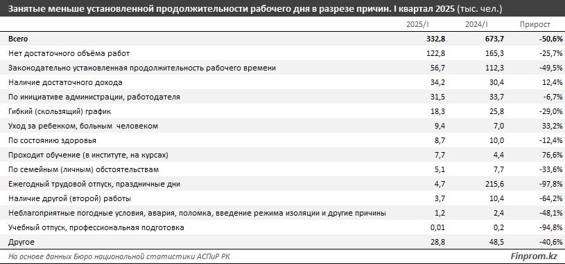 Чаще всего причиной неполной занятости является недостаточный объём работы — по этой причине меньше нормы трудились 122,8 тыс. человек, тогда как годом ранее таких было 165,3 тыс. Среди других распространённых причин — законодательно установленная сокращённая продолжительность рабочего времени (56,7 тыс. человек), наличие достаточного дохода (34,2 тыс.), решение работодателя или администрации (31,5 тыс.) и гибкий график (18,3 тыс. человек).