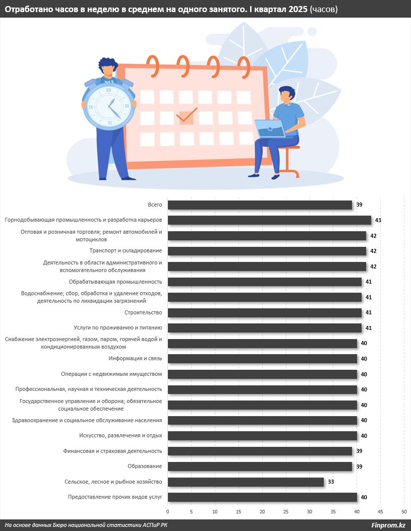 Сколько работает средний казахстанец и как это зависит от сферы его занятости? Подробно об этом рассказали в Finprom.kz.