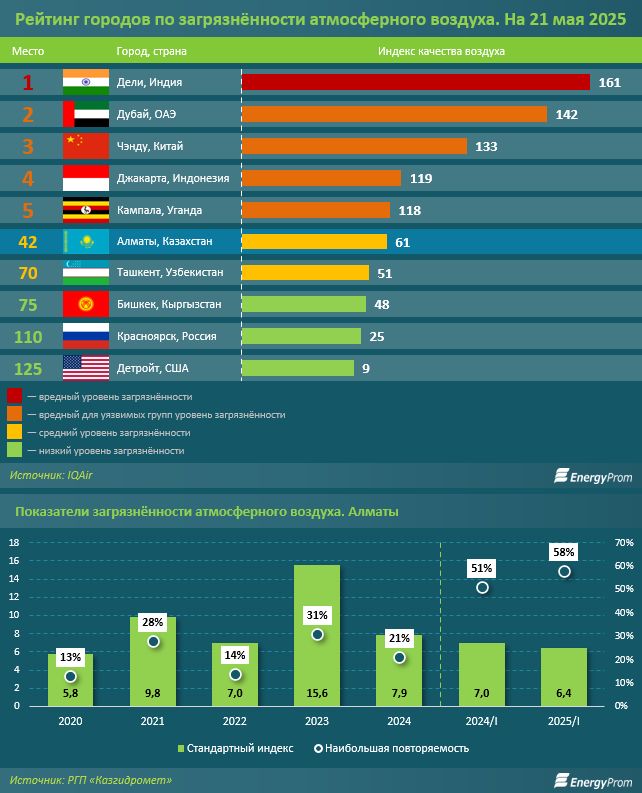 Алматы в очередной раз попал в список городов с самым грязным воздухом. Всего в рейтинг, который составляет международная компания IQAir, вошли 125 крупных городов мира. Во второй половине мая текущего года Южная столица Казахстана заняла 42-е место в этом рейтинге. Уровень загрязнённости в Алматы — средний, индекс качества воздуха — 61, передает energyprom.kz.