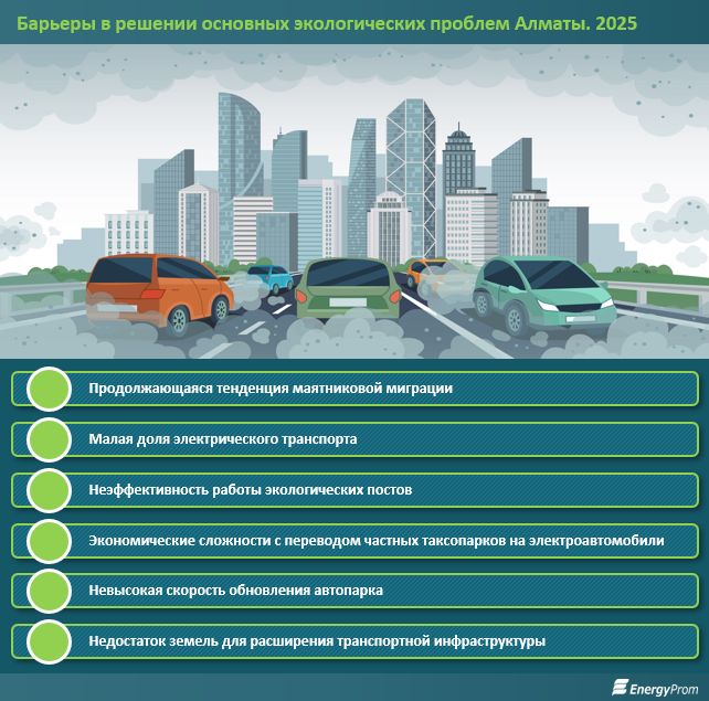Барьеров в решении экологических проблем Алматы, связанных с транспортом, много. Все они требуют долгосрочных стратегий и серьёзных инвестиций. Одним из вариантов разгрузки Южной столицы от такого огромного потока автотранспорта должно, в первую очередь, стать решение проблем маятниковой миграции. Ведь именно въезд огромного количества автомобилей из области, на которые не рассчитана дорожная инфраструктура Алматы, является одной из причин экологической перегрузки. Когда близ Алматы появится ещё один мегаполис, Алатау, он сможет взять на себя часть демографической нагрузки Южной столицы. Тем более, что город будет строиться по принципам Smart City, при его проектировании будут изначально заложены средства на строительство широких проспектов и магистралей, системы «умного» контроля (в том числе экологического).
