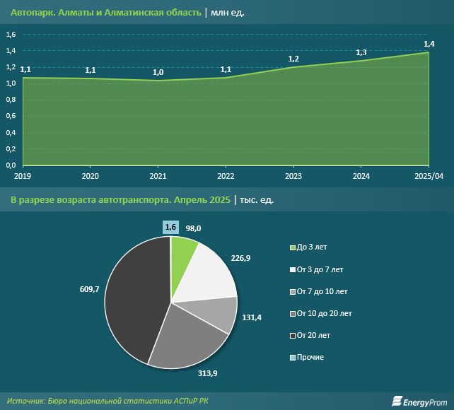 Согласно данным Бюро национальной статистики АСПиР РК, за последние несколько лет автопарк Алматы и Алматинской области вырос на 28,8%. В начале мая текущего года количество автомобилей в агломерации приблизилось к 1,4 млн. Мы специально учитывали общее число авто не только в Южной столице, но и в ближайшей области, так как из-за маятниковой миграции в город ежедневно въезжают десятки тысяч автомобилей. Почти половину из них можно отнести к автохламу: 609,7 тыс. машин эксплуатируются уже более 20 лет, ещё 313,9 тыс. машин — от 10 до 20 лет.