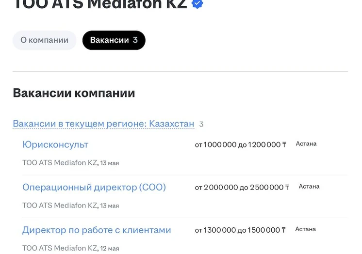 У ТОО "ATS Mediafon KZ" на Headhunter открыты три вакансии с приличными окладами.