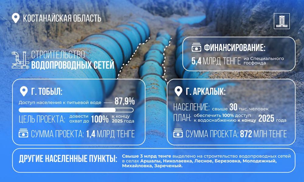 Еще 872 млн тенге выделили на прокладку водопровода в г. Аркалык. Реализация проекта позволит обеспечить питьевой водой город с населением свыше 13 тыс. человек, увеличив доступ к услугам водоснабжения с 96,5% до 100% к концу 2025 года.