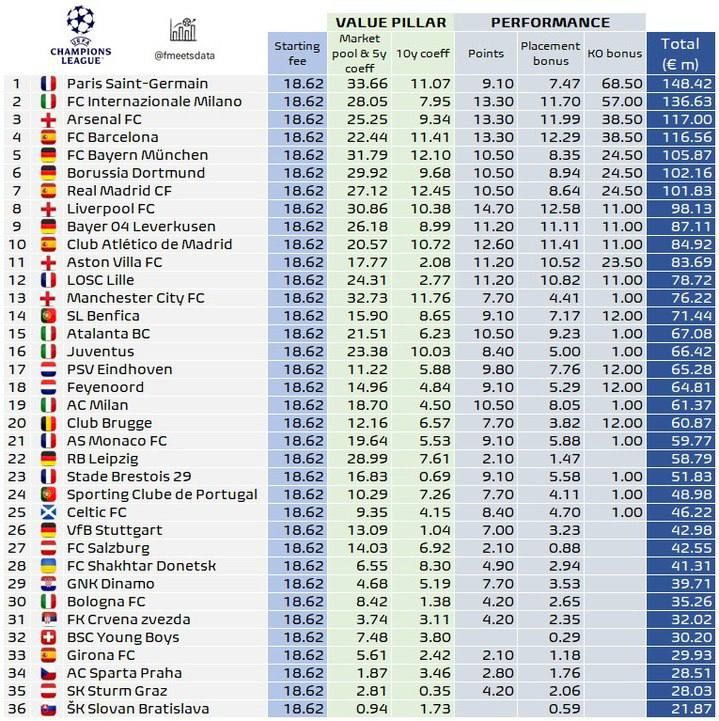 Абсолютным лидером по заработку стал французский клуб «Пари Сен-Жермен», который разгромил миланский «Интер» в финале Лиги чемпионов со счётом 5:0. За выступление в турнире ПСЖ получит €148,2 млн.