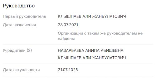 По информации Kompra.kz, директором ТОО "Group of the Companies TDA" является Али Клышпаев, который является одним из соучредителей компании. Вторым соучредителем является родная сестра первого президента Казахстана Анипа Назарбаева.