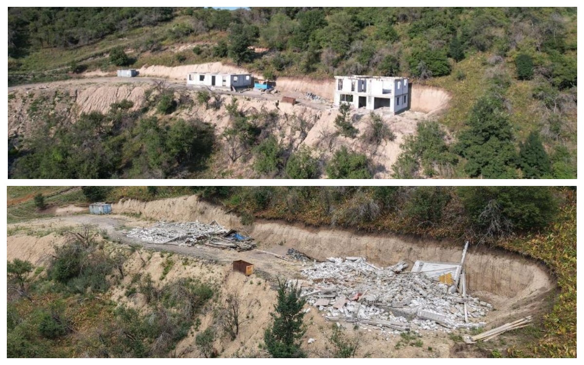 Собственник (физлицо), не имея разрешительных документов, возводил дома в горной местности. Кроме того, в ходе работ на данных участках была нарушена экосистема вследствие подрезки склона предгорной части для прокладки дороги на строительство объектов.