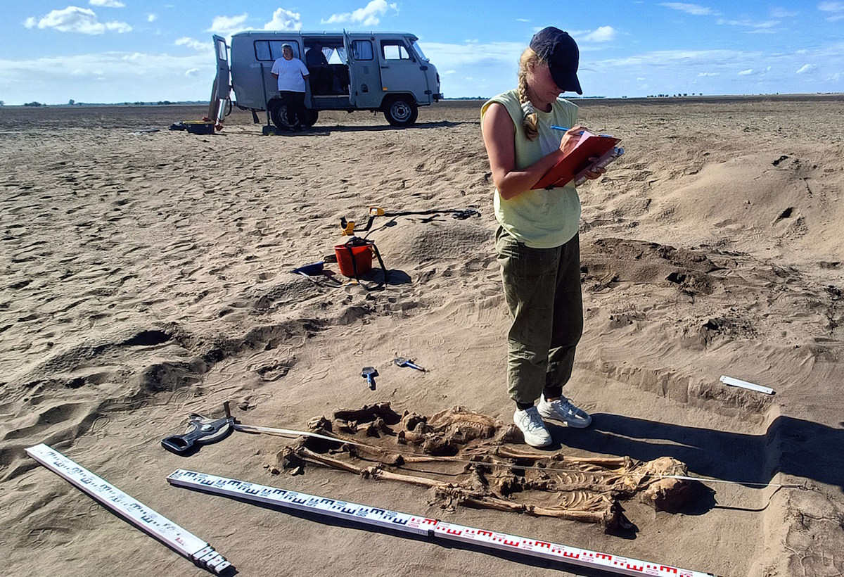 Обследование территории памятника участниками экспедиции выявило погребение эпохи Великого переселения народов, датируемое предварительно IV–V веками нашей эры. В этом незатронутом захоронении были найдены человеческие останки, а также остатки шкуры с головой и ногами коня, предметы вооружений той эпохи. Среди находок – костяные накладки на лук, железные наконечники стрел и колчанный крюк. Также в погребении были обнаружены железные пряжка, нож и удила.
