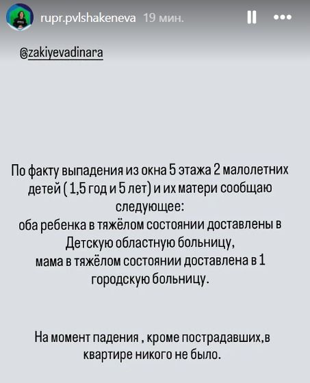 "Установлено, что 30 июля из окна подъезда, расположенной между 4 и 5 этажами дома по улице Нурмагамбетова в Павлодаре, выпали двое малолетних детей и женщина. Пострадавшие упали на козырек подъезда, все доставлены в больницу. Возбуждены уголовные дела по фактам покушения на убийство и самоубийство. Обстоятельства и причины произошедшего будут установлены в ходе расследования".