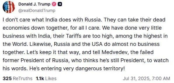 Мне все равно, чем Индия занимается с Россией. Они могут вместе завалить свои мертвые экономики, мне все равно. У нас очень мало сотрудничества с Индией, их тарифы слишком высоки, почти самые высокие в мире. Так же, у России и США почти нет совместного бизнеса. Давайте сохраним это так, как есть, и скажите Медведеву, провалившемуся бывшему президенту России, который до сих пор думает, что он президент, следить за словами. Потому что он заходит на очень опасную территорию , — пишет Трамп.