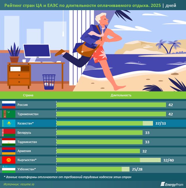 Среди стран Центральной Азии и ЕАЭС, по данным Resume, самые длинные оплачиваемые периоды отдыха наблюдаются в России и Туркменистане: по 42 дня. В РФ это 28 оплачиваемых отпускных дней и 14 праздничных выходных, в Туркменистане — 30 и 12 дней соответственно.