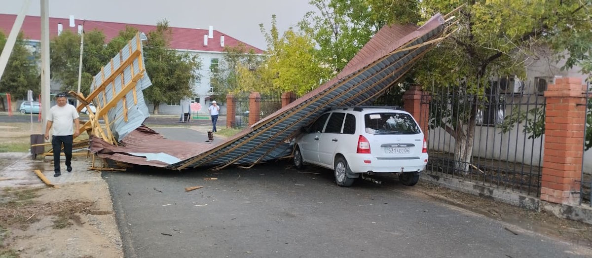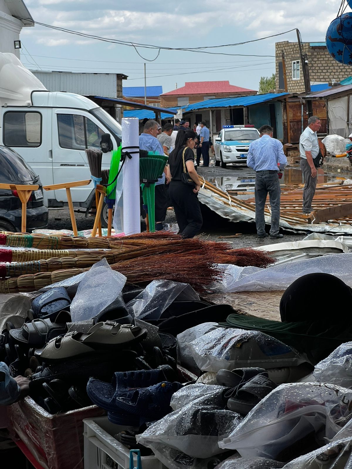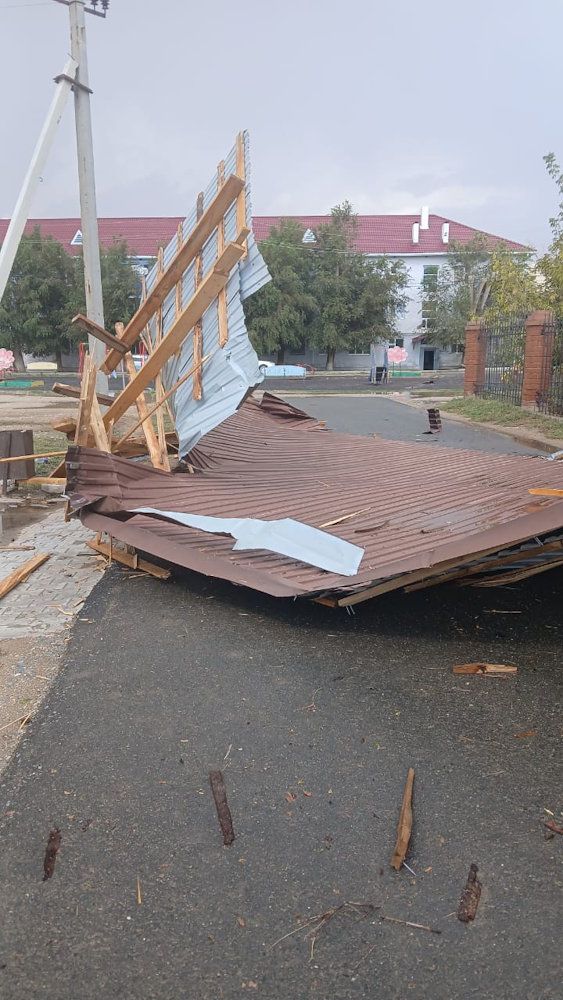 У многоквартирного дома на улице Нурманова, школы имени Ш. Уалиханова, детского спортивного зала и здания рынка «Талап» часть кровли обрушилась на землю, а на игровой площадке детского сада «Ботақан» произошли разрушения. До села Есбол местами упали электрические столбы.