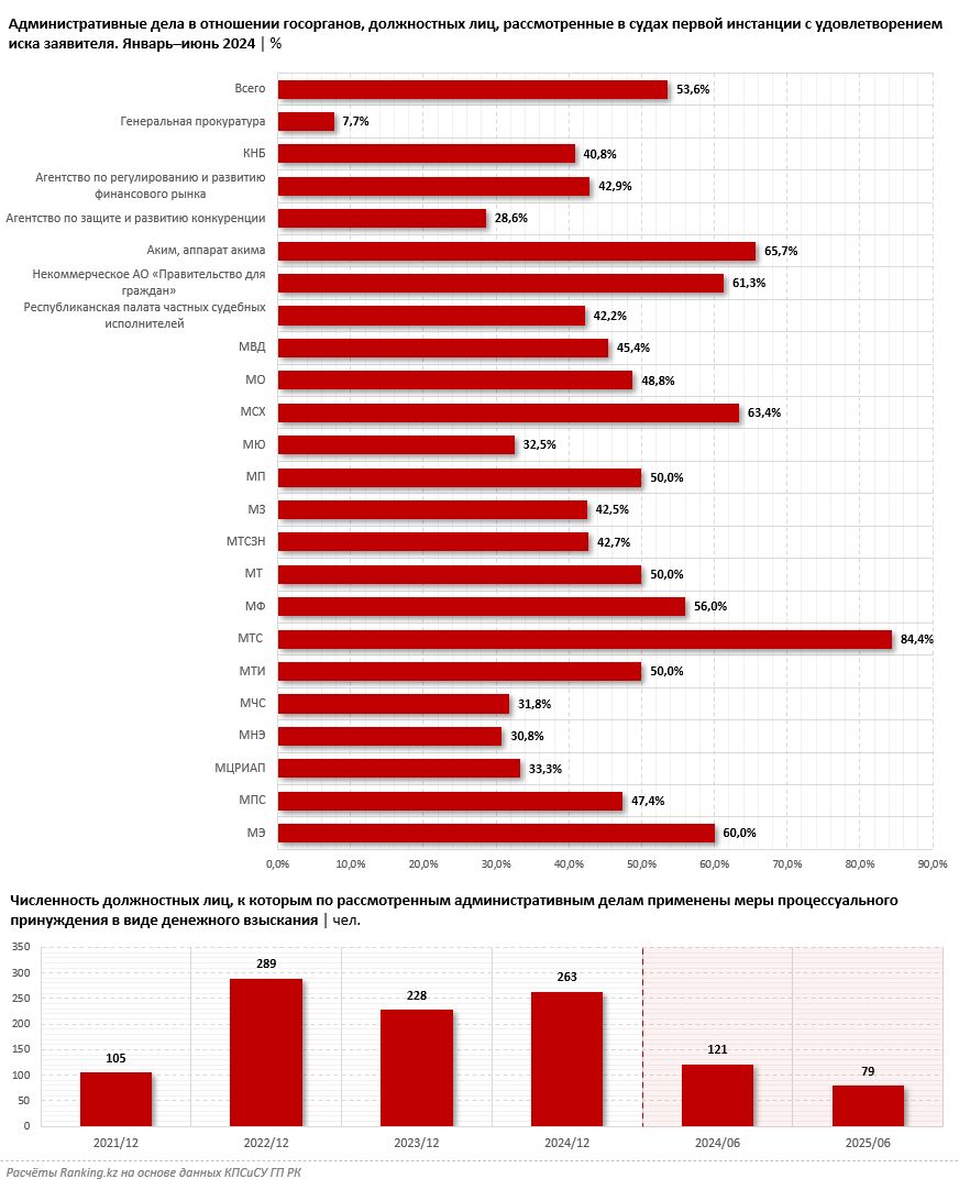 Любопытно, что доля выигранных дел против госорганов сильно разнится в различных государственных ведомствах. Например, иски против акиматов в 65,7% случаев заканчивались победой истцов. При судебных разбирательствах с Генеральной прокуратурой таких высоких шансов победить в споре нет: доля дел, по которым суд первой инстанции вставал на сторону истцов, составила всего 7,7%.