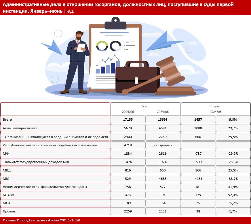 Граждане стали чаще подавать в суды на чиновников. По данным Комитета по правовой статистике и специальным учётам Генеральной прокуратуры (КПСиСУ) РК, за первое полугодие 2025-го в суды первой инстанции поступило около 17,2 тыс. административных дел в отношении госорганов или должностных лиц. В сравнении с январём–июнем прошлого года рост составил 9,3%. Почти все (99,7%) такие дела — это иски об оспаривании тех или иных действий госкомпаний или конкретных чиновников, пишет ranking.kz.