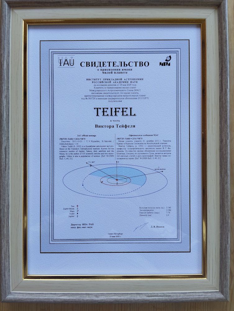 Институт прикладной астрономии Российской академии наук на основании решения от 19 мая 2025 года Комитета по наименованию малых планет Международного Астрономического Союза (МАС) выслал свидетельство о присвоении имени Виктора Тейфеля малой планете 2016 NR70.