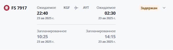 По сообщениям пассажиров рейса Караганда-Анталья FS 7917, который должен был вылететь в 10:25, вылет отложили более чем на 12 часов из-за неисправности самолета. Судя по сайту авиакомпании, вылет планируется в 22.40.