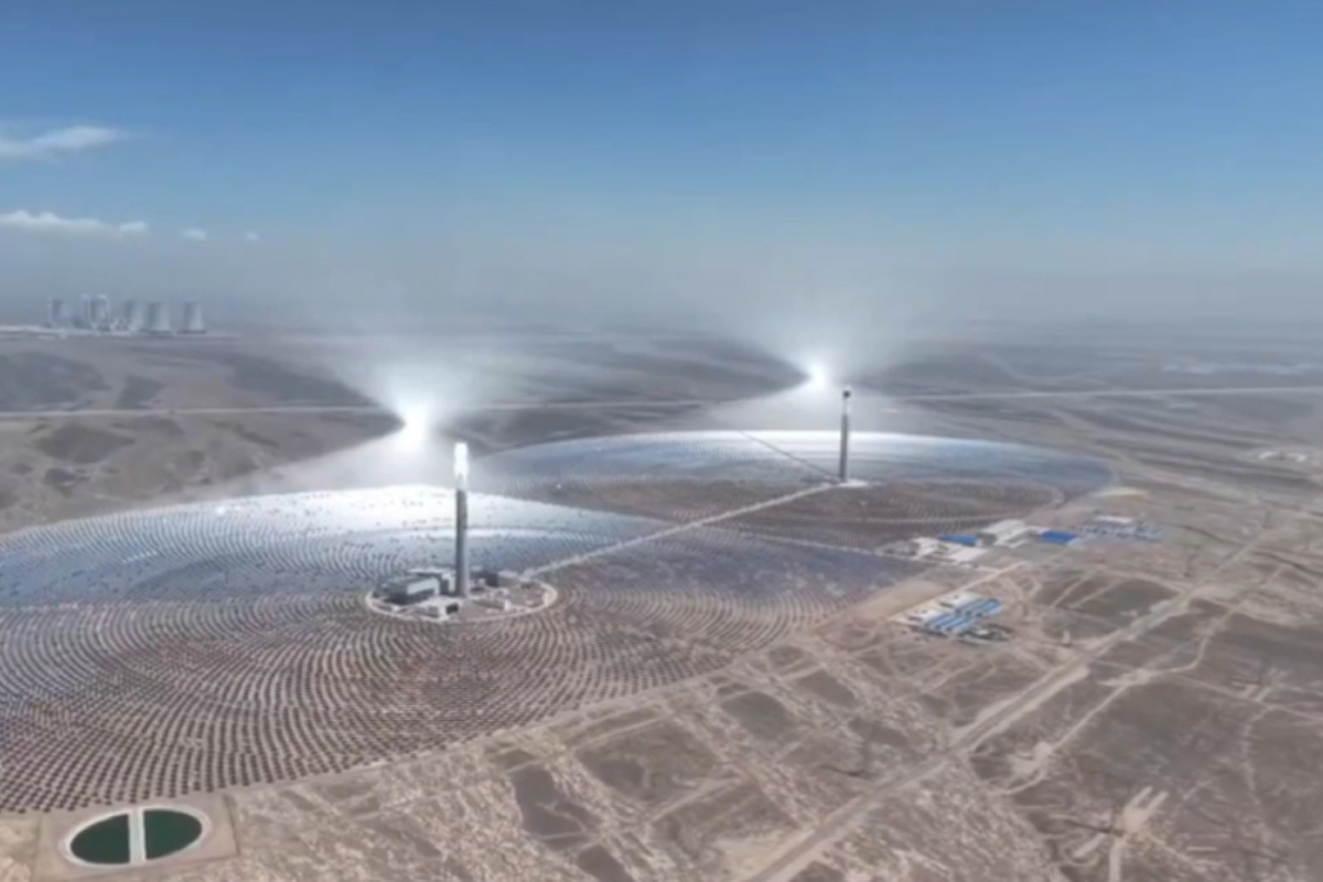Электростанция расположена в регионе Ганьсу и состоит из 30 тысяч зеркал, которые направляют свет на 200-метровые шпили. Особый солевой раствор, превращается в пар и крутит турбины.