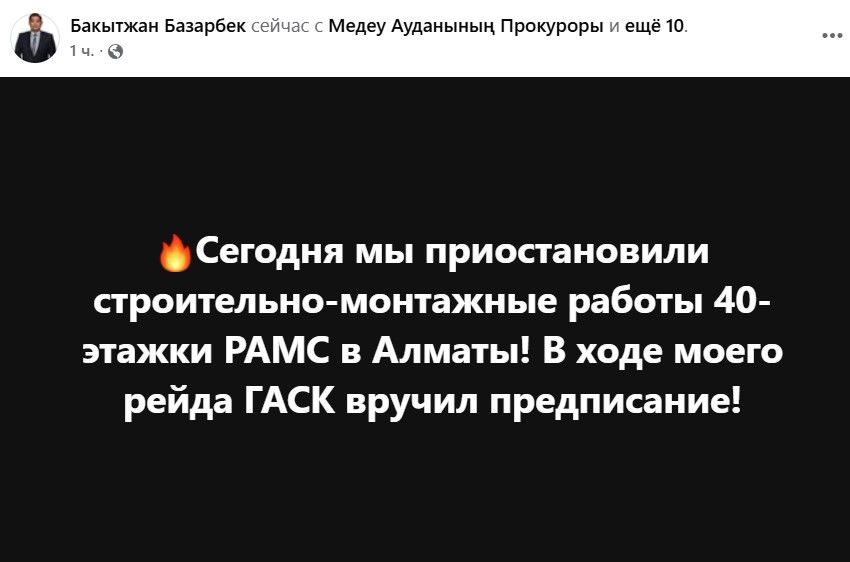 Об этом сообщил депутат Мажилиса Бакытжан Базарбек на своей странице в Facebook. По его словам, в ходе рейда ГАСК вручил застройщику официальное предписание.