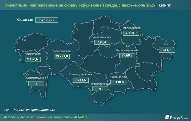 Посмотрим, как Казахстан инвестирует в своё экологическое благополучие. За январь–июль текущего года капвложения, направленные на охрану окружающей среды, составили 87,6 млрд тг — в 4,8 раза больше, чем за аналогичный период 2024-го.