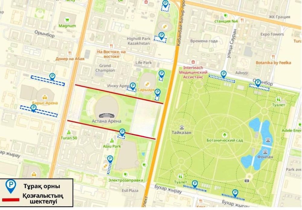 Для удобства гостей и обеспечения безопасности во время проведения матча будет ограничено движение транспорта в районе стадиона «Астана Арена» — со стороны Ледового дворца «Алау» и велотрека «Сарыарка».