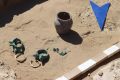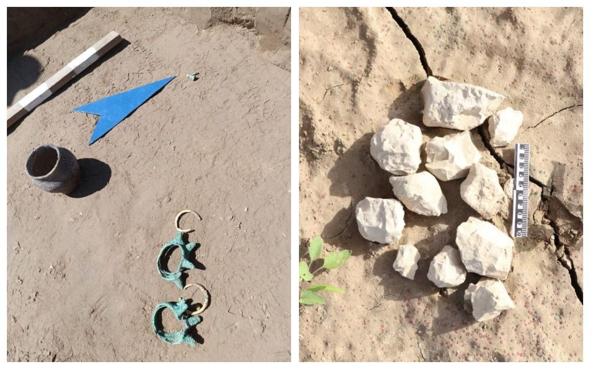 Кроме того, проведены раскопки нескольких захоронений позднего бронзового века. Хотя человеческие останки сохранились плохо, археологам удалось обнаружить керамические сосуды с геометрическим орнаментом, украшение для виска с золотым покрытием и бронзовой основой, кольца, браслеты, серьги с ободком, а также множество мелких бусин для головного убора. По словам руководителя археологического центра А.Подушкина и научного сотрудника Г.Стамкуловой подобные находки на территории Туркестанской области ранее не фиксировались.