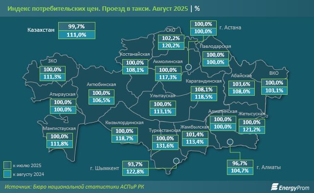 В региональном разрезе в месячной динамике удорожание было отмечено только в 4 из 20 регионов РК — Карагандинской (на 8,1%), Абайской (на 3,6%), Северо-Казахстанской (на 2,2%) и Жамбылской (на 1,4%) областях. Удешевление проезда в такси наблюдалось в Алматы (на 3,3%) и Шымкенте (6,3%). В остальных 14 регионах цены остались на уровне прошлого месяца.
