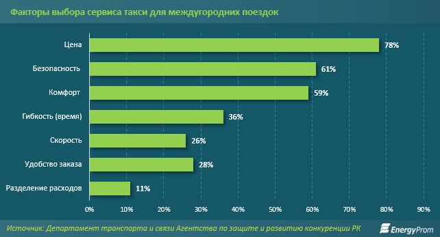Напоследок немного интересных данных. Департамент транспорта и связи Агентства по защите и развитию конкуренции РК провёл анализ рынка услуг такси с применением аппаратно-программного комплекса или мобильного приложения заказа такси на междугородних пассажирских перевозках. В рамках исследования были опрошены 120 пассажиров, чтобы выяснить, насколько автобус и поезд могут служить для них реальной альтернативой при изменении цен на такси.