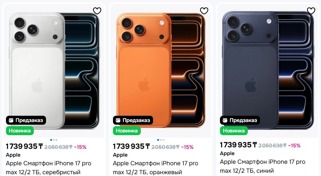 На маркетплейсах предзаказ варьируется от 677 938 тенге за iPhone 17 (256 ГБ) до 1 739 935 тенге за iPhone 17 Pro Max (2 ТБ).