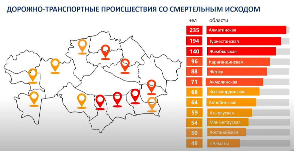 Вице-министр по сути признался, что усилий полиции в этом направлении недостаточно и переложил часть ответственности на акиматы. Из 12 регионов, отмеченных Лепехой, антилидерами по «смертельным» ДТП стали Алматинская (235), Туркестанская (194) и Жамбылская (140) области. В Атырауской области за отмеченный период произошло 59 ДТП со смертельным исходом.