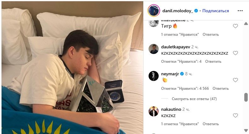 После завоевания трофея 20-летний киберспортсмен повторил знаменитое фото Лионеля Месси — он сфотографировался, притворившись спящим с кубком в руках и флагом Казахстана на плечах.