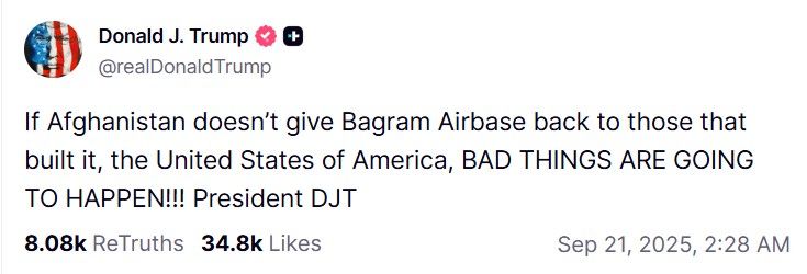 - Если Афганистан не отдаст авиабазу Баграм тем, кто ее построил, США, произойдут плохие вещи, - написал глава Белого дома.