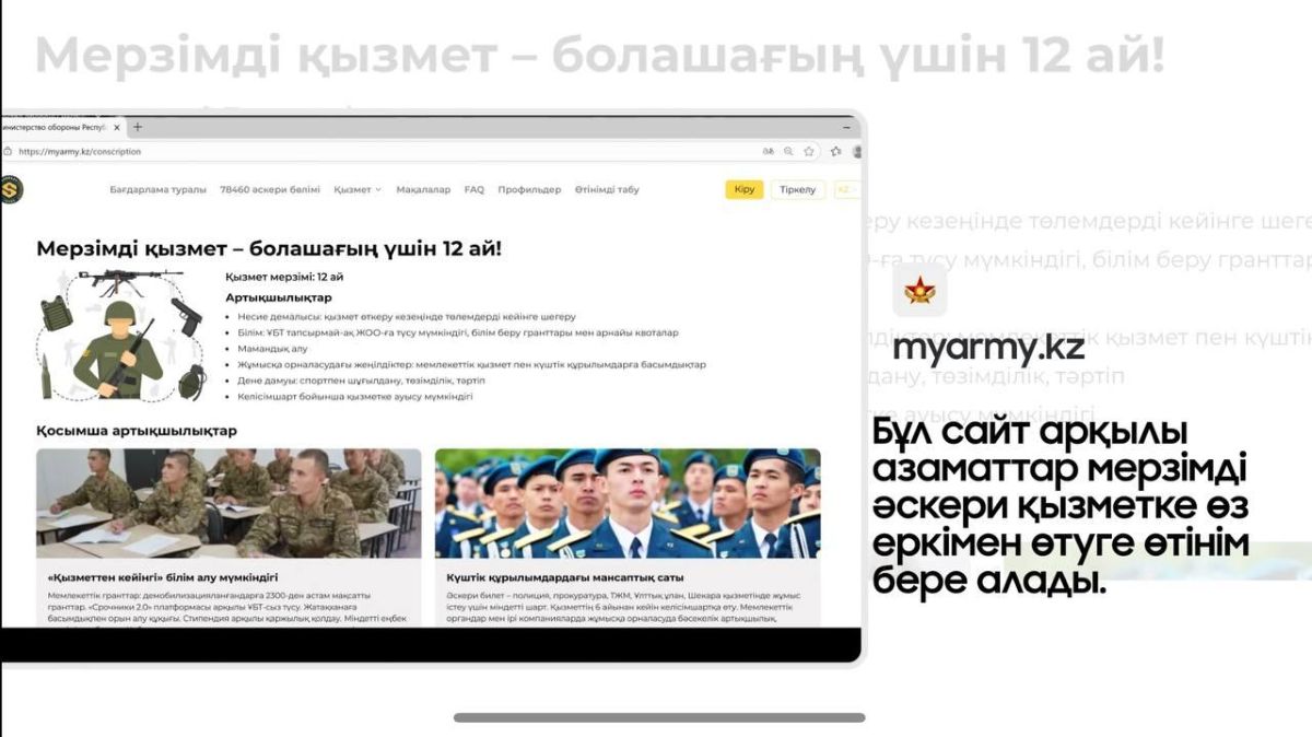 Министерство обороны Республики Казахстан запустило новый интернет-портал MyArmy.kz, призванный стать единой цифровой площадкой для взаимодействия граждан с армией.