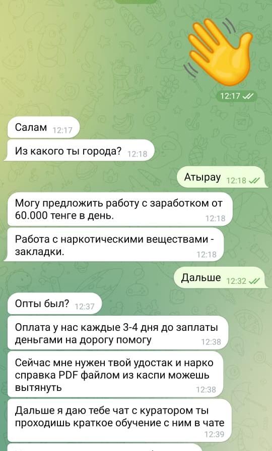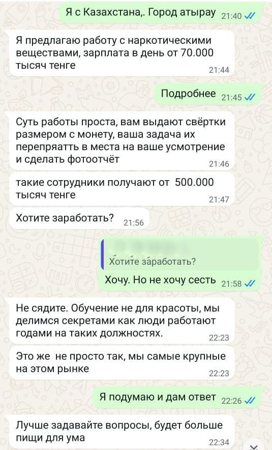 В третьем случае некий Мирас, полагая, что я нахожусь в подростковом возрасте, ни разу в переписке не упомянул про наркотики, пообещал минимум тысячу долларов в неделю и официальное трудоустройство через кадровое агентство.