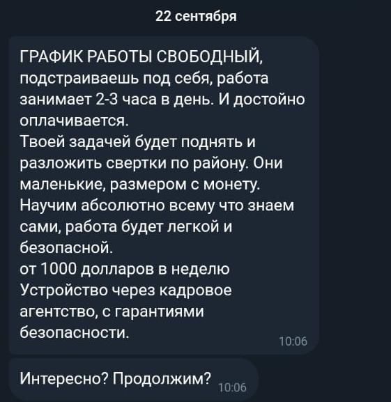 Чтобы не попасться на удочку вербовщиков, важно обращать внимание на следующие тревожные признаки: слишком высокая оплата без опыта и навыков, отказ сразу раскрыть суть работы, общение только в мессенджерах (Telegram, WhatsApp и часто через ботов), отсутствие официального оформления, использование терминов вроде «логистика», «курьер-доставщик», «работа с наличкой», «ночные смены»…