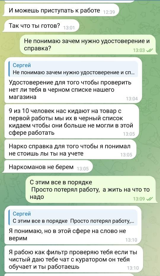 Во втором случае у меня потребовали удостоверение личности и справку с наркодиспансера, якобы для проверки по черному списку. При этом вербовщик, представившийся Владом, посетовал на трудности работы с закладчиками, которые либо оказываются наркоманами, либо, получив товар, с ним же и исчезают. На этом этапе всё общение с преступником было, разумеется, прекращено.