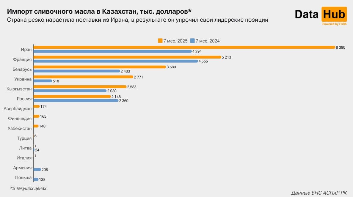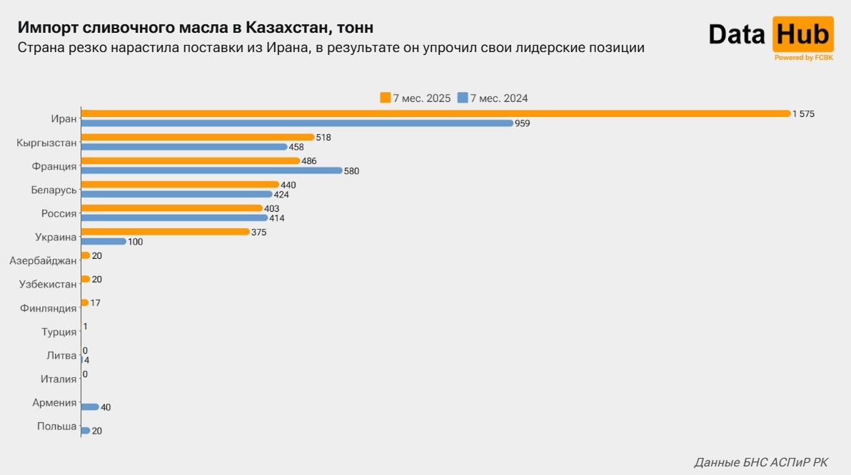 Казахстан в 2025 году активно увеличивает импорт сливочного масла из Ирана, передает Data Hub.