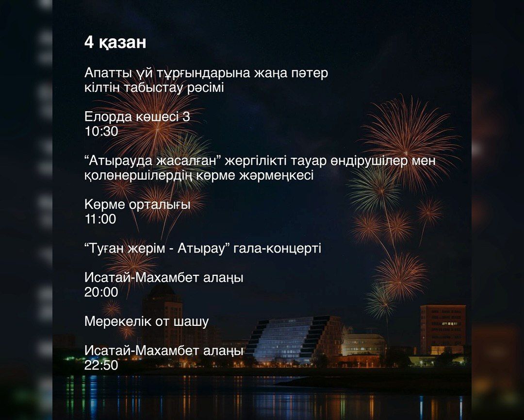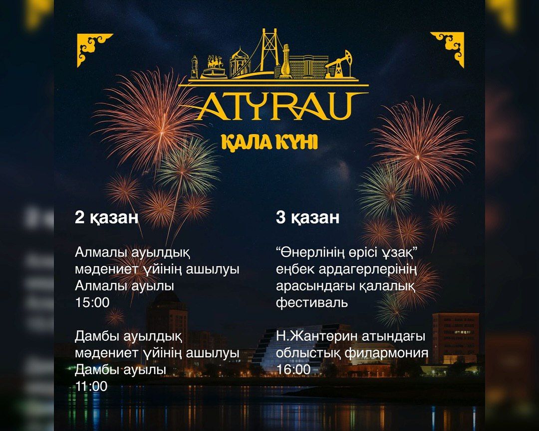 Театрализованные представления, концерты, спортивные соревнования и народные ярмарки пройдут во всех районах области. Основная праздничная программа состоится 4 октября на площади им. Исатая и Махамбета. В 20:00 запланирован гала-концерт «Туған жерім – Атырауым», который завершится красочным фейерверком.
