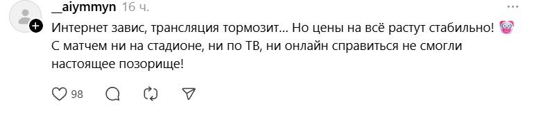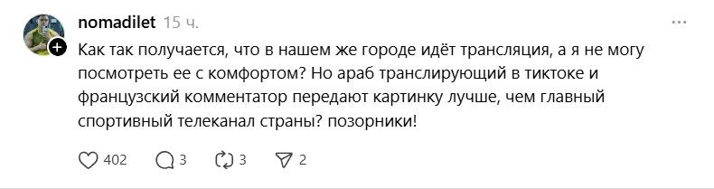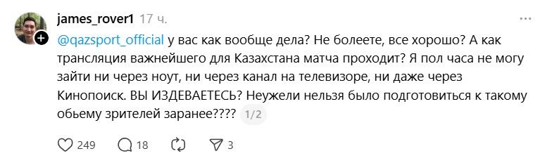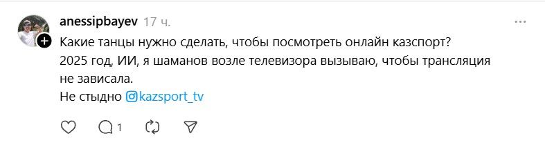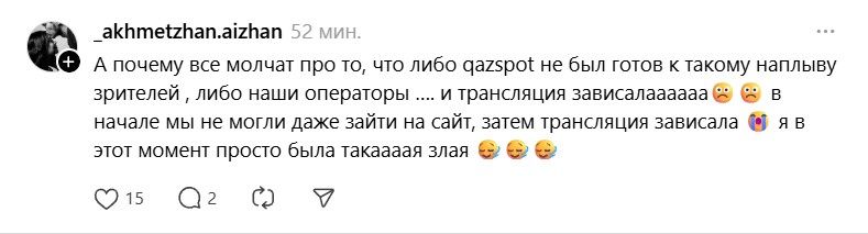 Зрители массово жаловались на зависания сайтов телеканалов Qazsport и Qazaqstan, а также стриминговых приложений. Эфир отставал от игры, что вызвало бурное обсуждение в соцсетях.