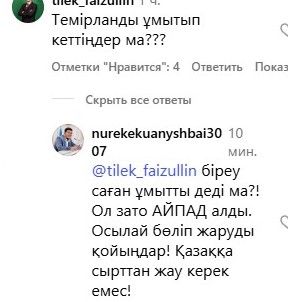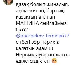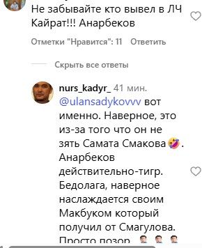 Однако у фанатов возникли вопросы: герой отборочного этапа Лиги чемпионов Темирлан Анарбеков, который в матче против «Селтика» в серии пенальти отразил три удара и обеспечил «Кайрату» выход в основную стадию турнира, получил в подарок лишь ноутбук Apple Macbook от бизнесмена Нурлана Смагулова.