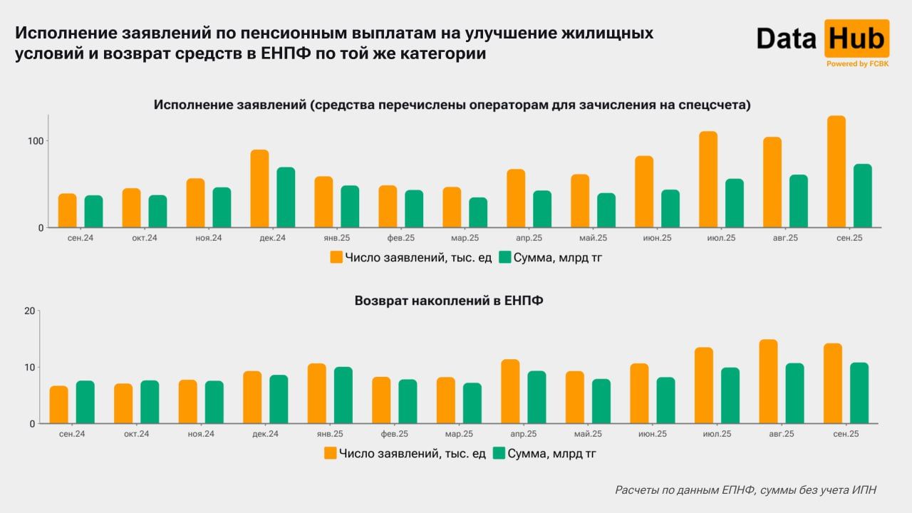 Тем временем направление «улучшение жилищных условий» остаётся самым стабильным: за сентябрь исполнено 128,9 тыс. заявлений на сумму 73,3 млрд тенге, что на 20% больше, чем в августе. Возвраты средств по этой категории не увеличились.